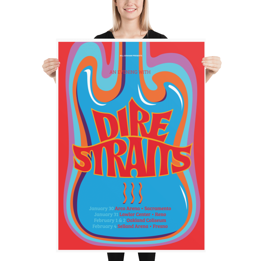 Retro concert poster featuring a recreation of the original tour poster artwork for 1992s An Evening with Dire Straits, with performances in Sacramento, Reno, Oakland and Fresno. Available exclusively from DireStraits.com.