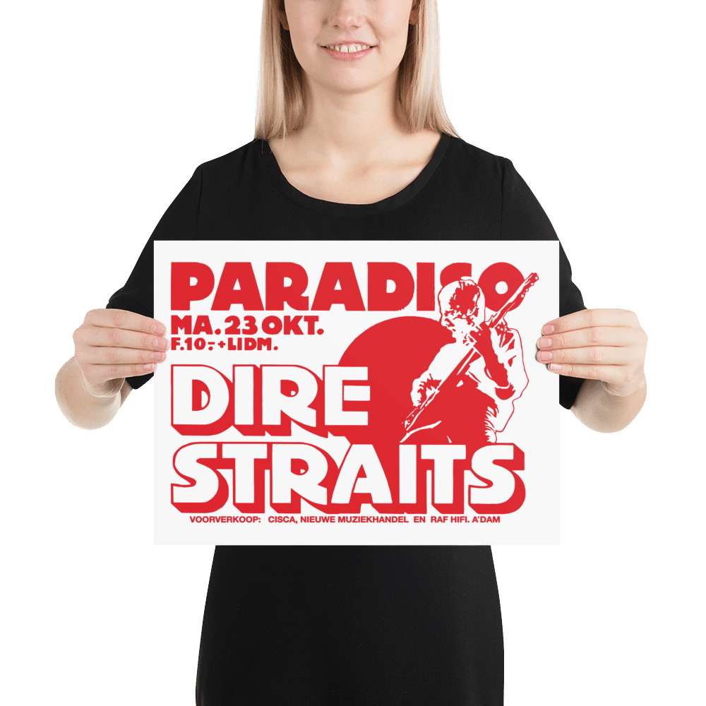 Retro concert poster featuring a recreation of the original gig poster artwork for 1978’s Paradiso Club concert, available exclusively from DireStraits.com